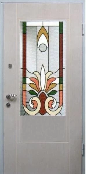 Входные двери в Мезене с применением декора витражом изготавливаются из стального профиля, придающего прочность конструкции, а сама витражная вставка обладает высокой взломостойкостью, поскольку для витражных композиций используется специальное стекло, обработанное особым образом. Усилить надежность витражного элемента можно с помощью использования декоративных кованных решеток.